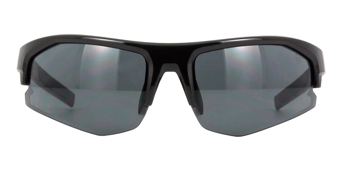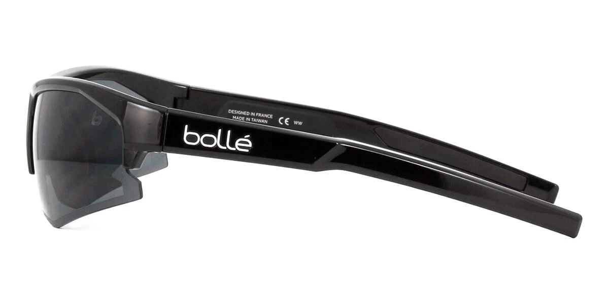 This wraparound Bolle sunglass comes in a shiny black frame with tns grey lenses.