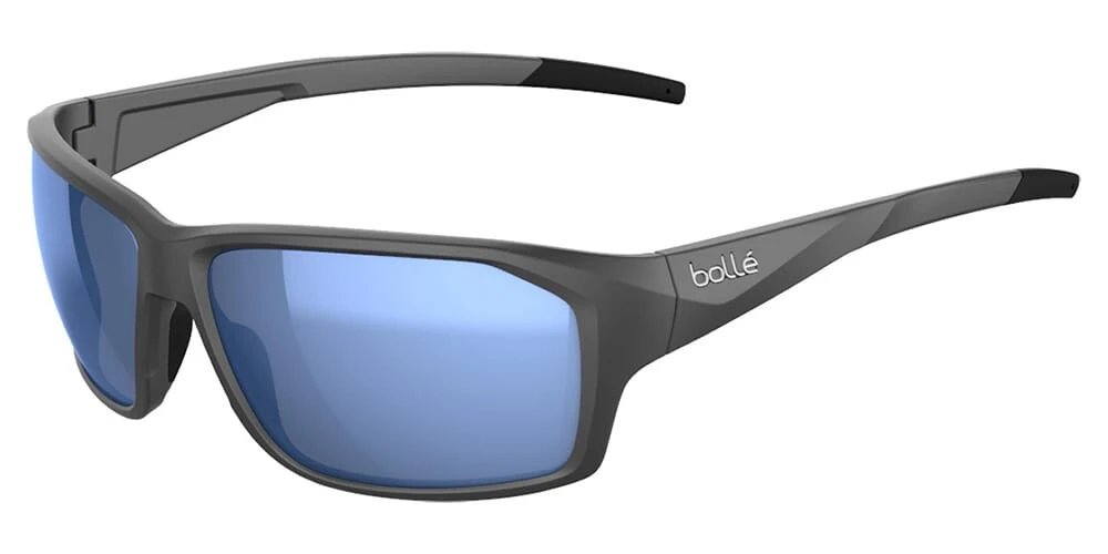 This rectangular Bolle sunglass comes in a titanium matte grey frame with volt grey solid tint cat 3 to 3 with blue flash mirror lenses.