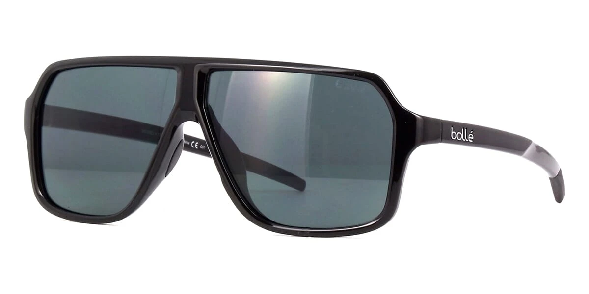 This aviator Bolle sunglass comes in a shiny black frame with tns grey lenses.