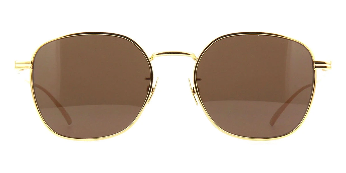 This square Bottega Veneta sunglass comes in a gold frame with brown lenses.