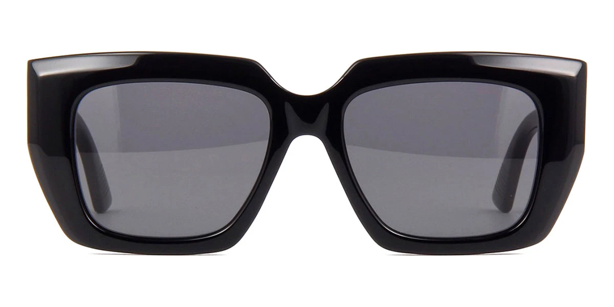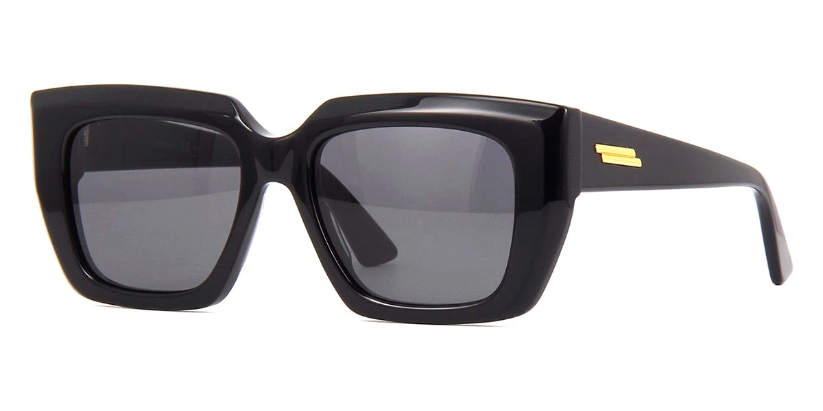 This square Bottega Veneta sunglass comes in a shiny black frame with grey lenses.