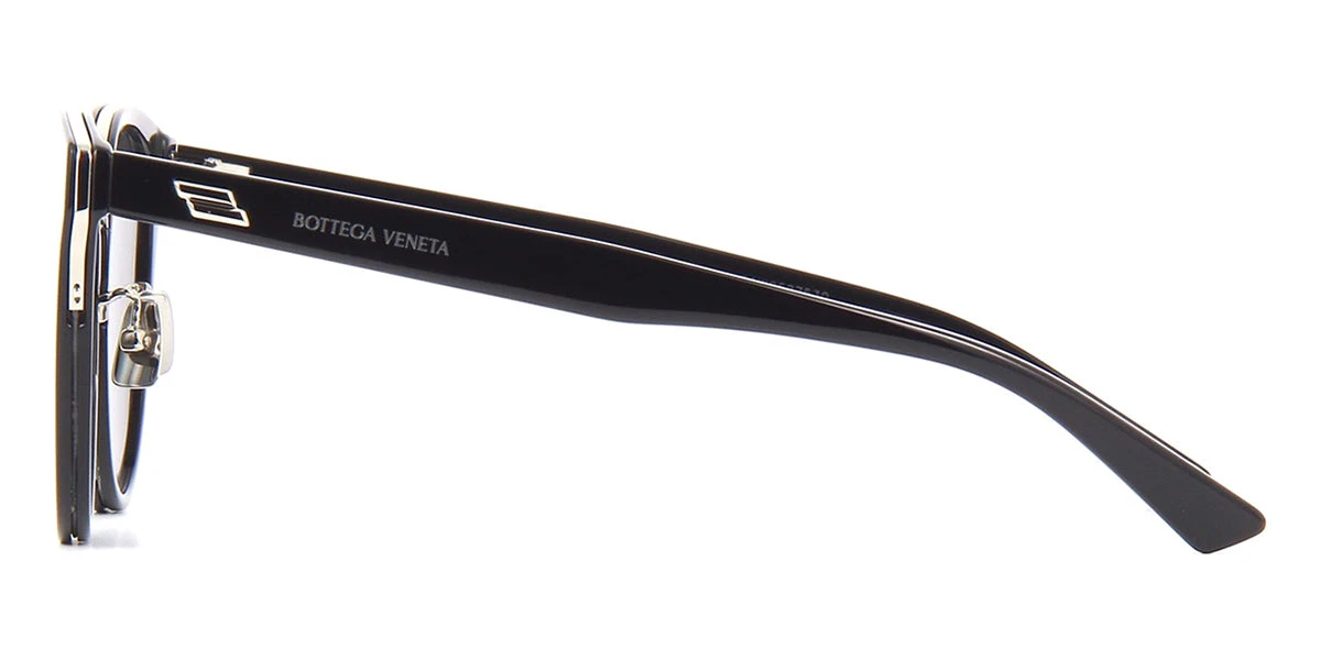 This round Bottega Veneta sunglass comes in a black and silver frame with grey lenses.