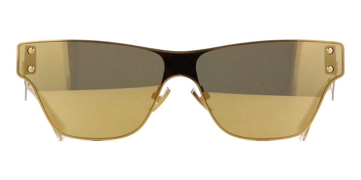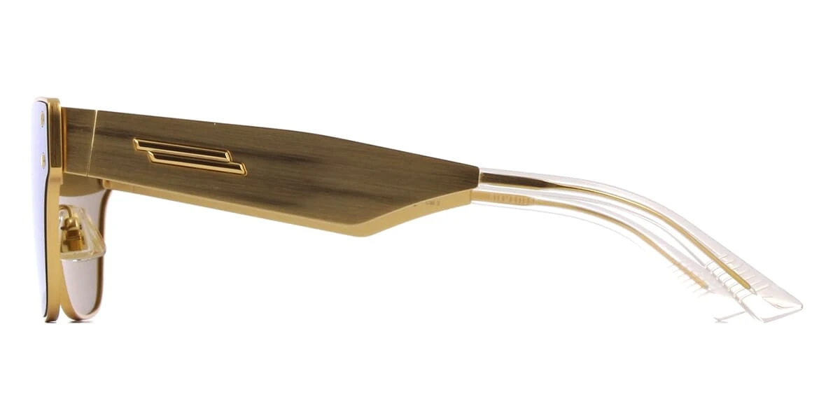 This shield Bottega Veneta sunglass comes in a brushed gold frame with brown with gold mirror lenses.