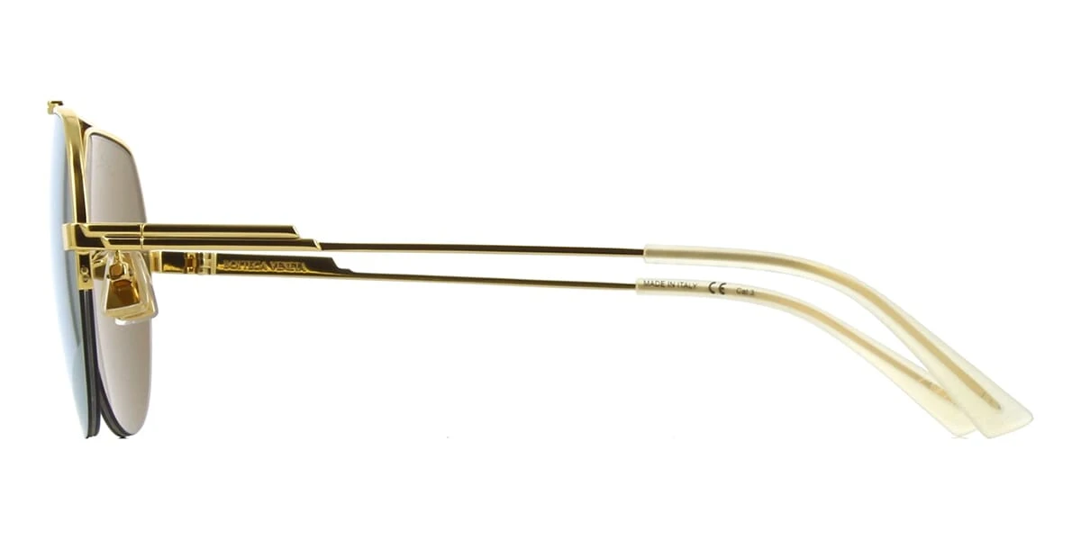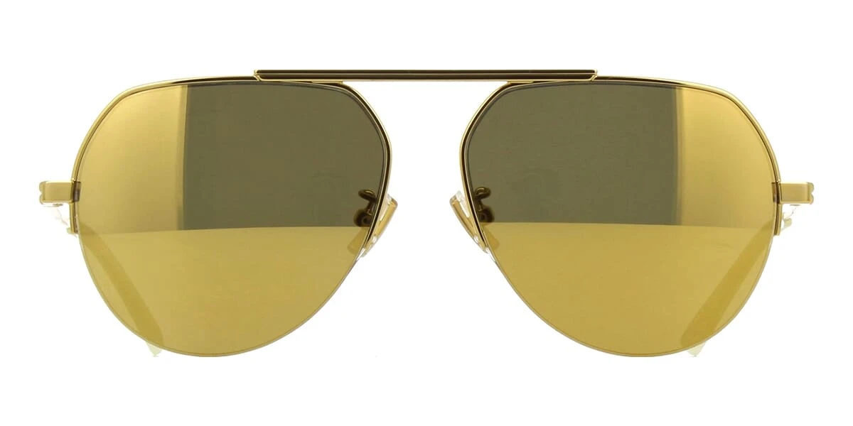 This aviator Bottega Veneta sunglass comes in a shiny gold frame with brown with gold mirror lenses.