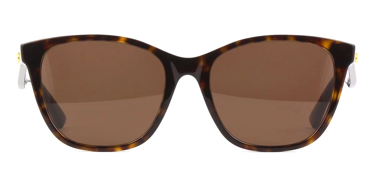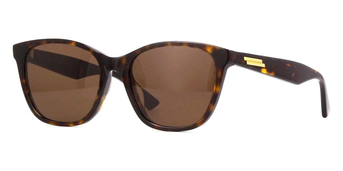 This cat eye Bottega Veneta sunglass comes in a shiny dark havana frame with brown lenses.