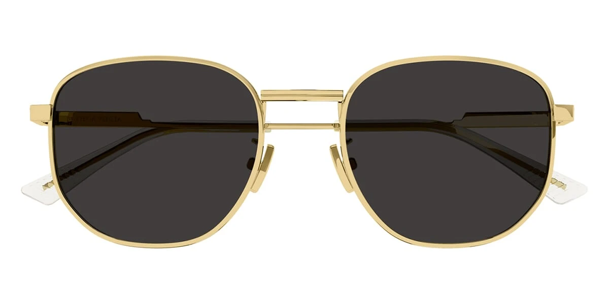 This square Bottega Veneta sunglass comes in a gold frame with grey lenses.