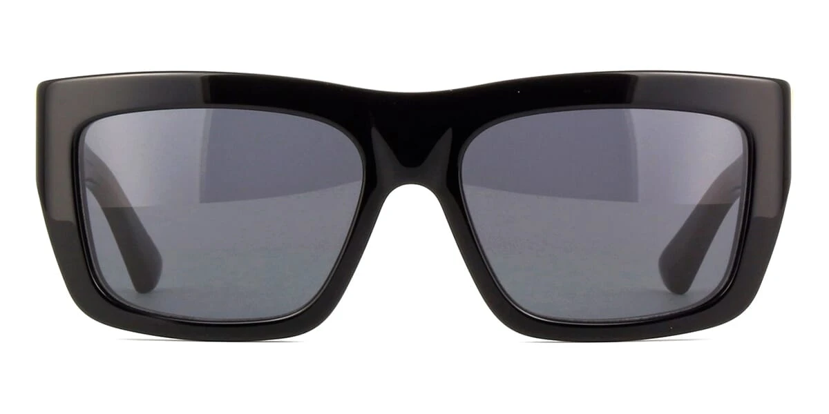 This square Bottega Veneta sunglass comes in a shiny black frame with grey lenses.