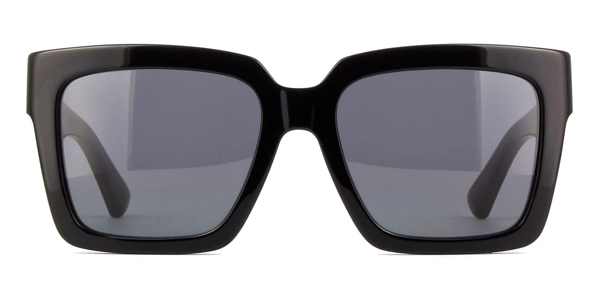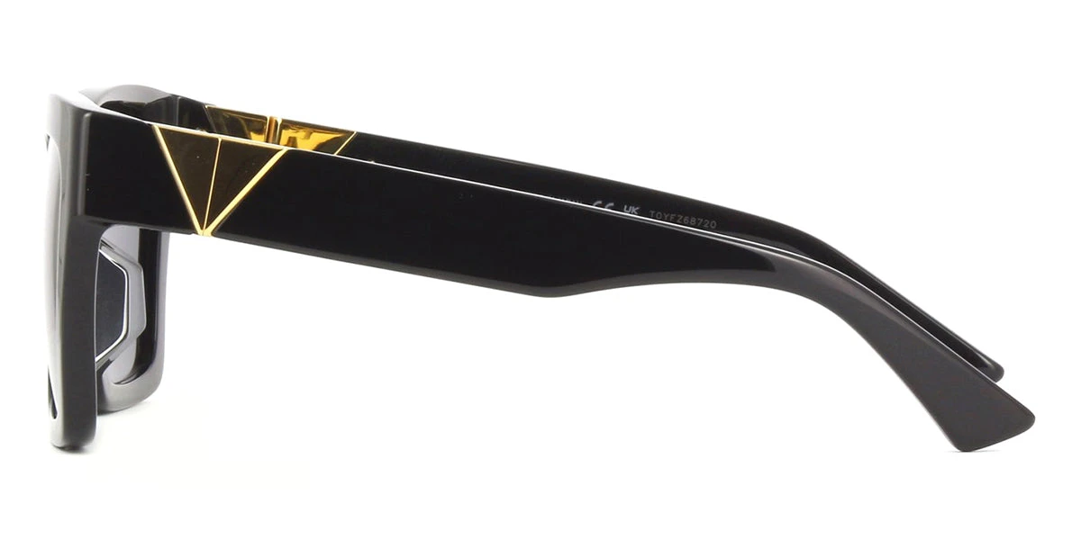 This square Bottega Veneta sunglass comes in a shiny black frame with grey lenses.