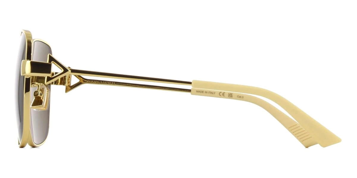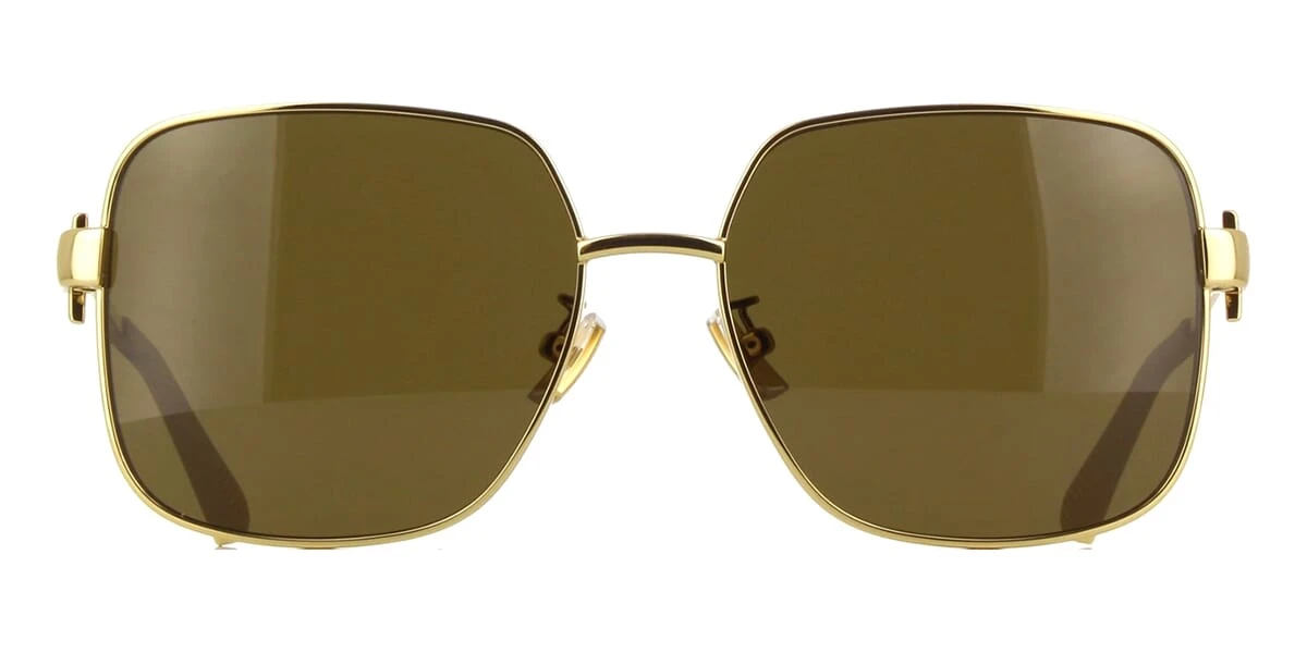 This square Bottega Veneta sunglass comes in a gold frame with brown lenses.