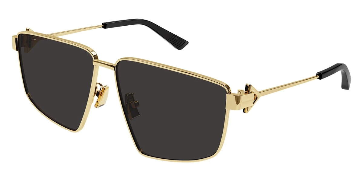 This square Bottega Veneta sunglass comes in a shiny gold frame with grey lenses.