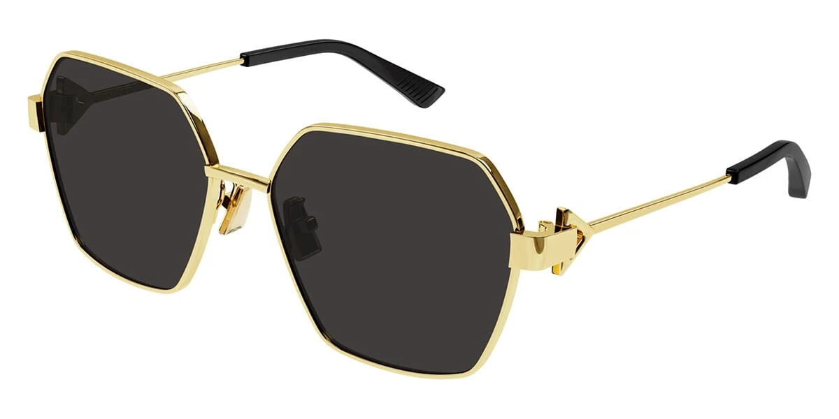 This square Bottega Veneta sunglass comes in a shiny gold frame with grey with light mirror lenses.
