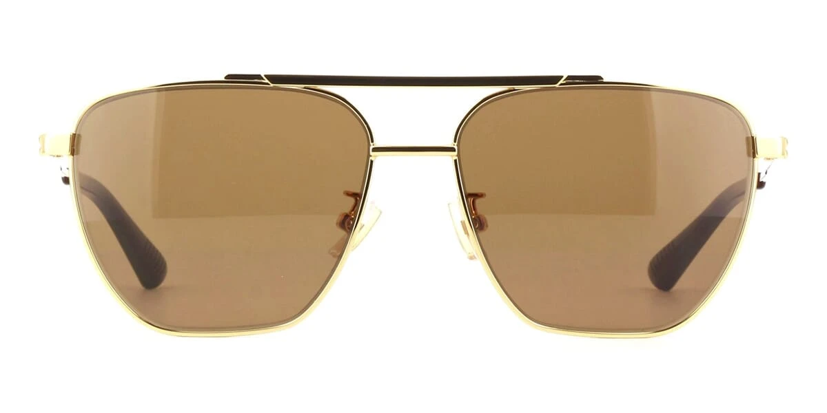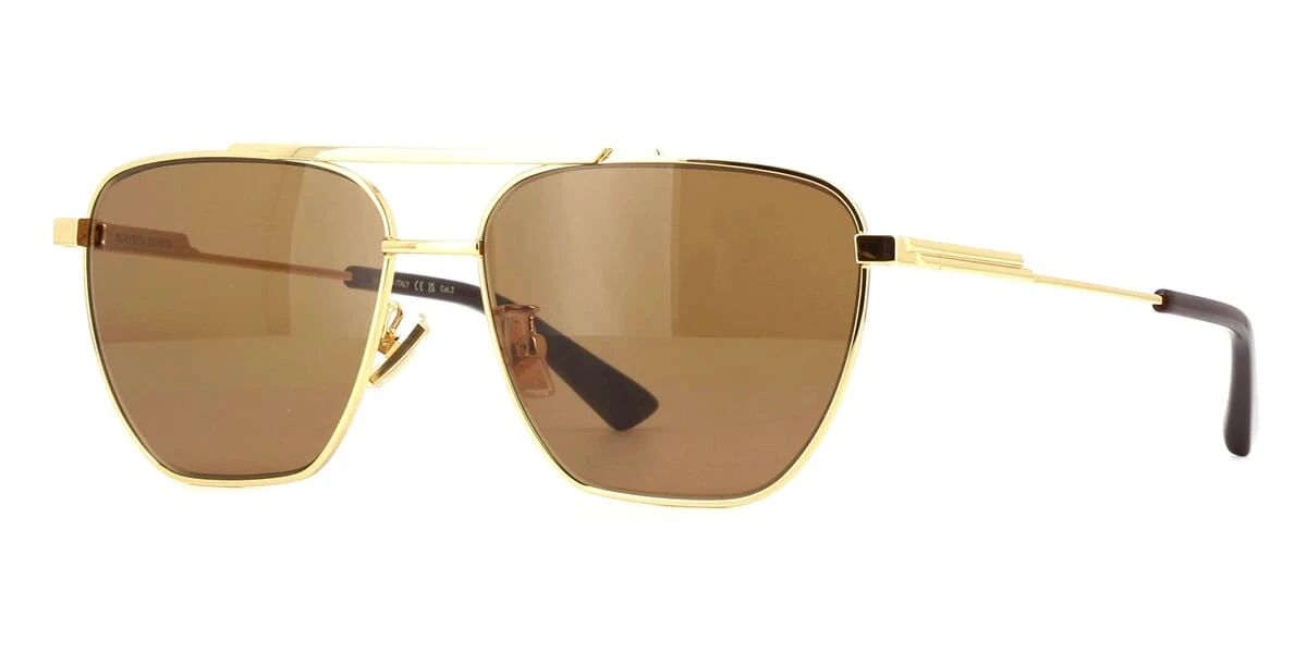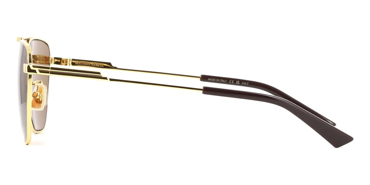 This aviator Bottega Veneta sunglass comes in a shiny gold frame with brown lenses.