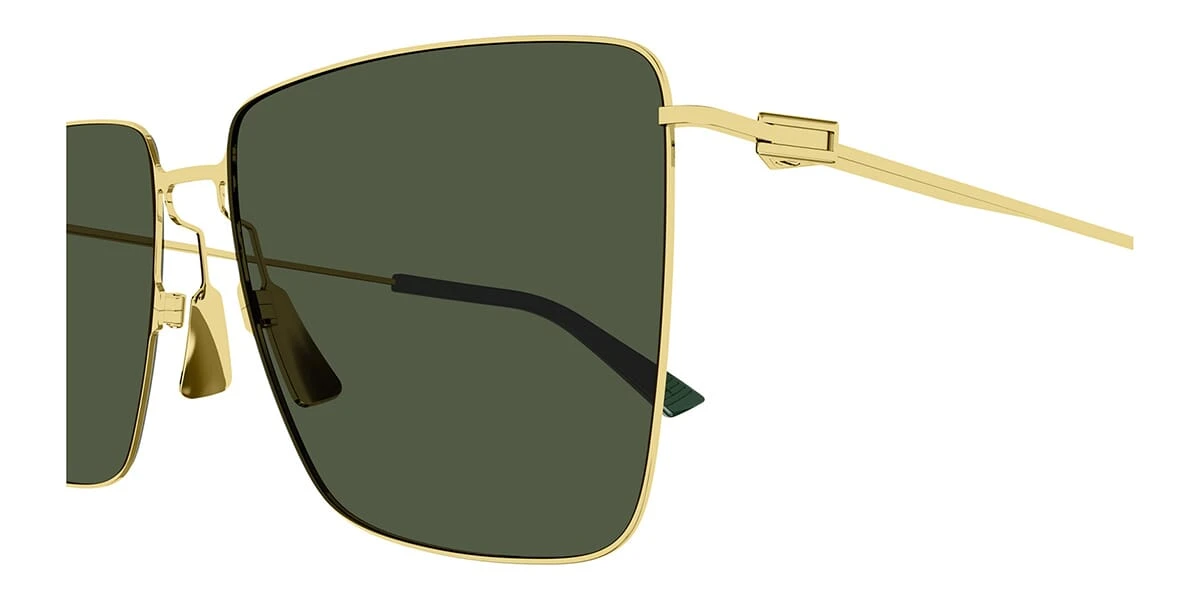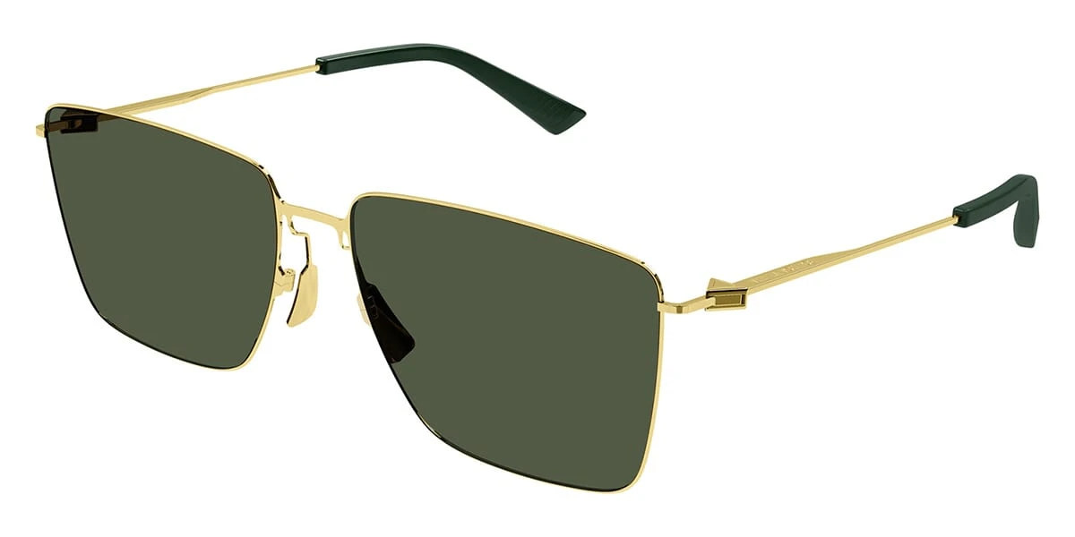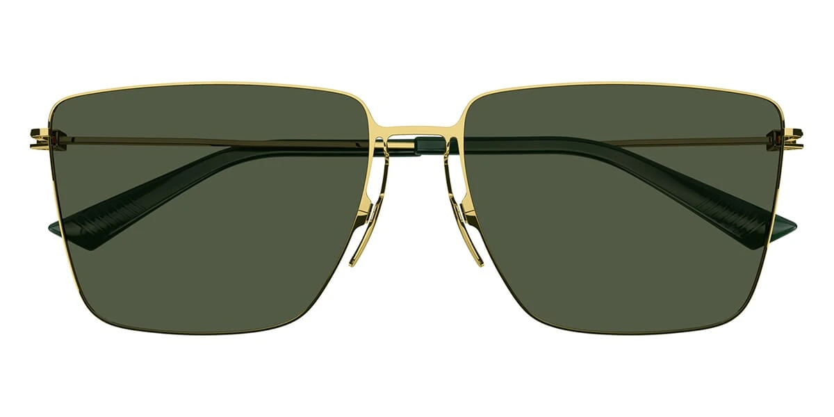 This square Bottega Veneta sunglass comes in a gold frame with green lenses.