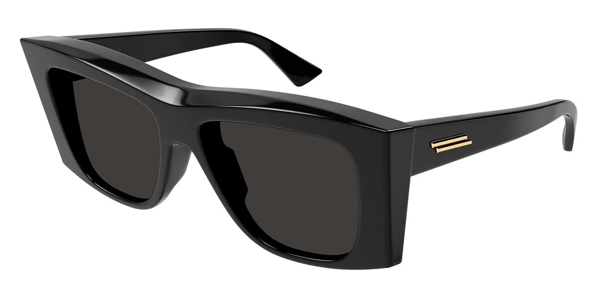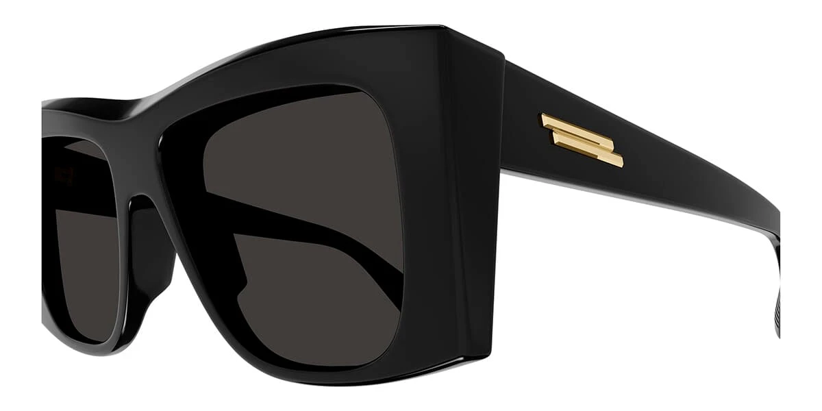 This square Bottega Veneta sunglass comes in a black with gold frame with grey lenses.