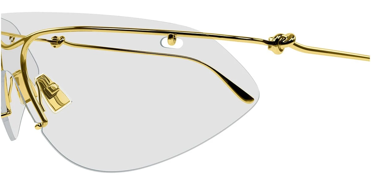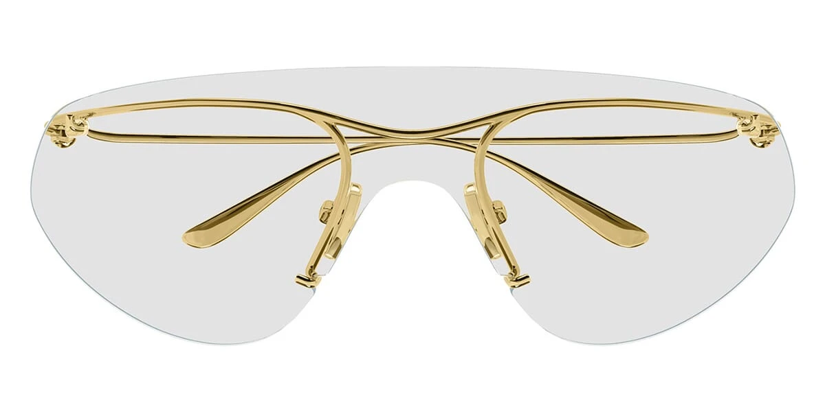 This shield Bottega Veneta sunglass comes in a gold frame with clear uv lens lenses.