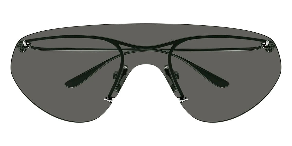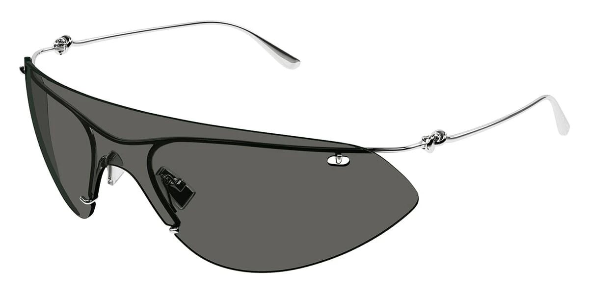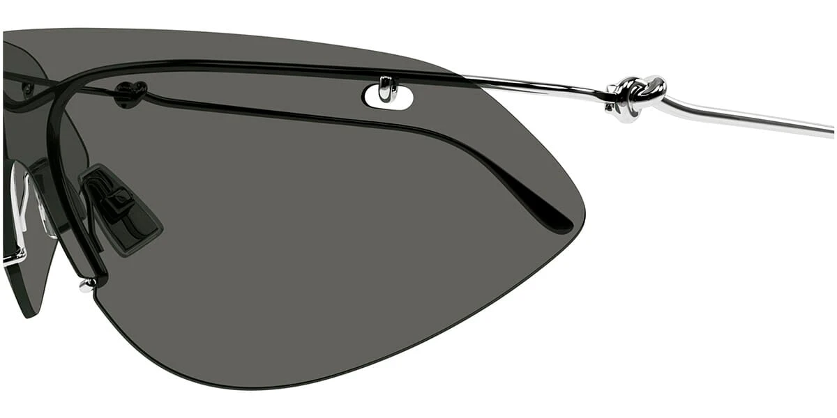 This shield Bottega Veneta sunglass comes in a silver frame with grey lenses.