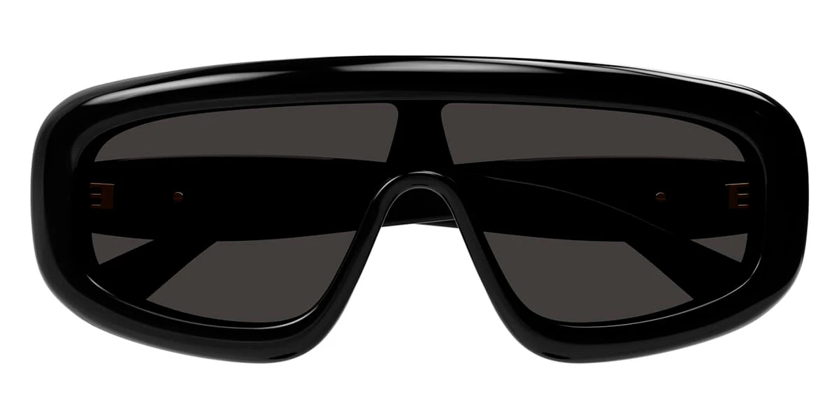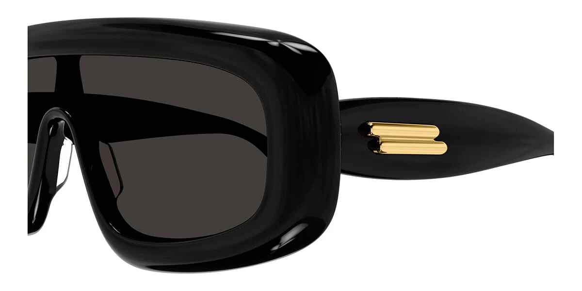 This shield Bottega Veneta sunglass comes in a black with gold frame with grey lenses.