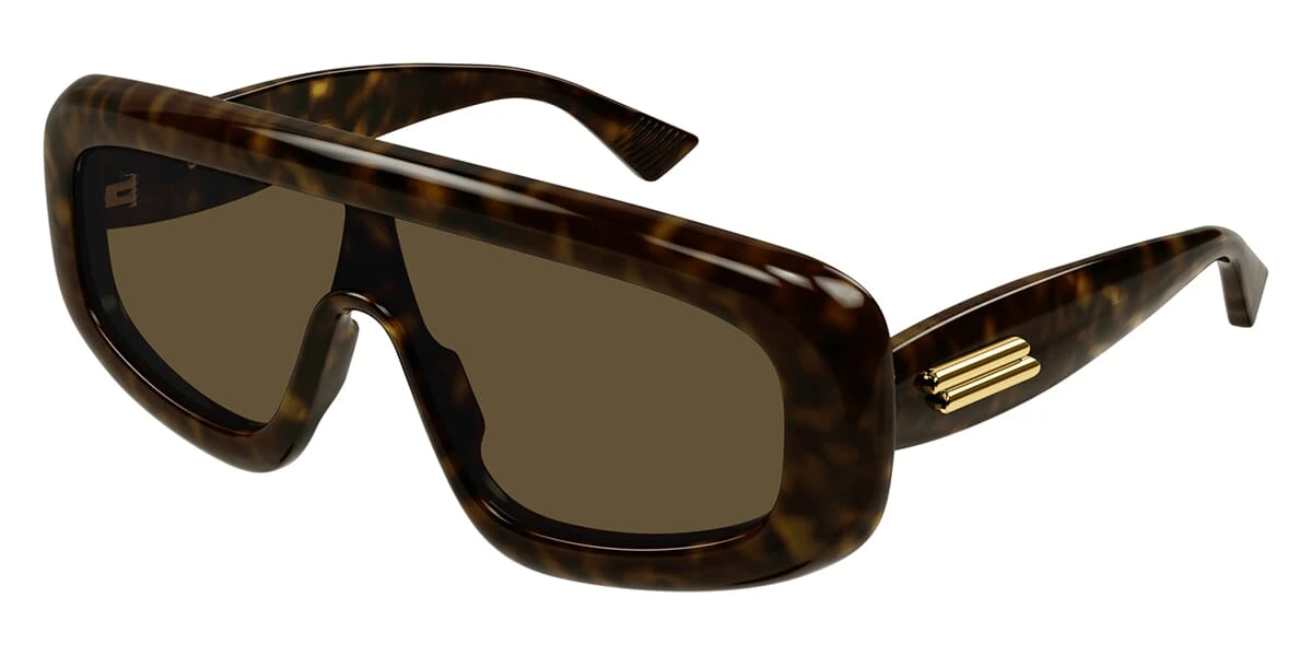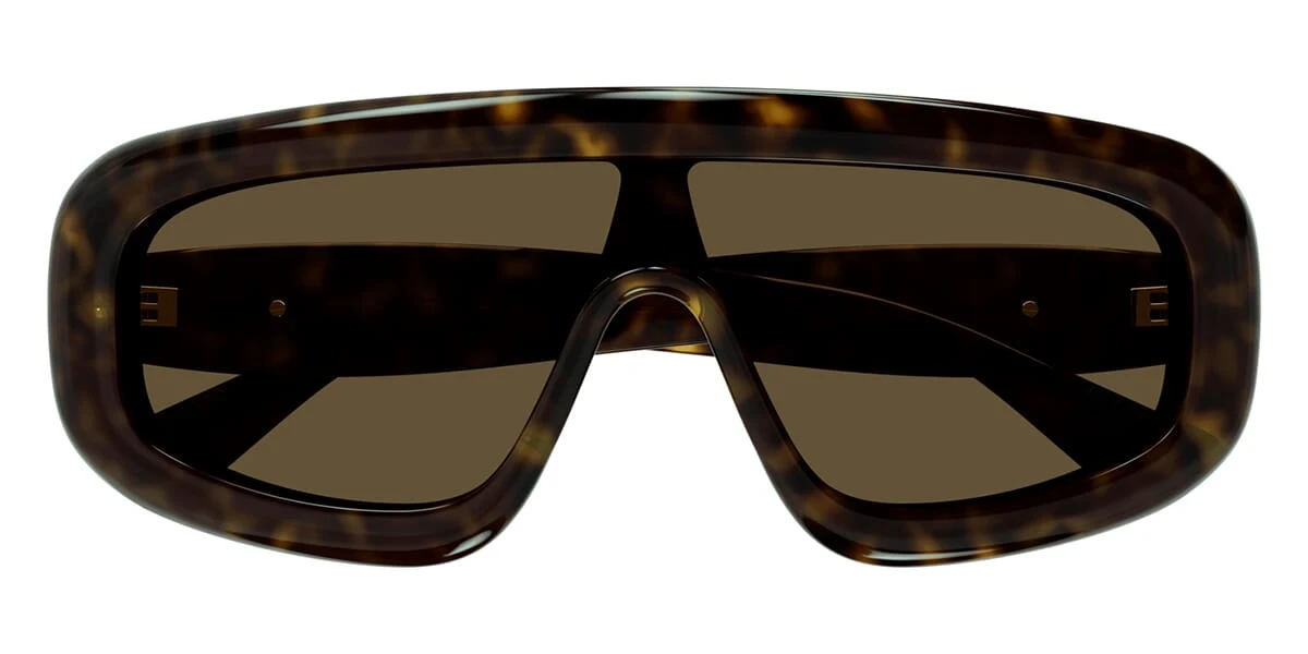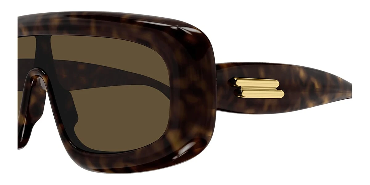 This shield Bottega Veneta sunglass comes in a havana frame with brown lenses.