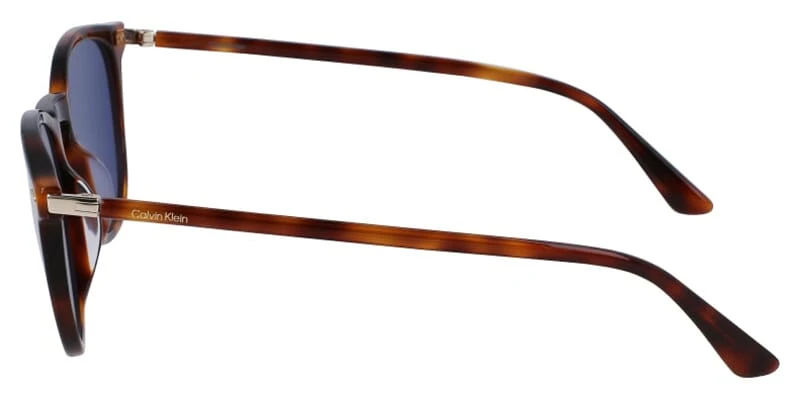 This round Calvin Klein sunglass comes in a brown havana frame with blue lenses.