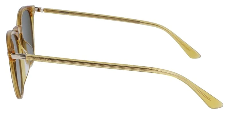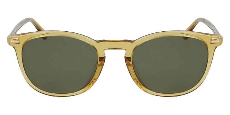 This round Calvin Klein sunglass comes in a butterscotch frame with green lenses.