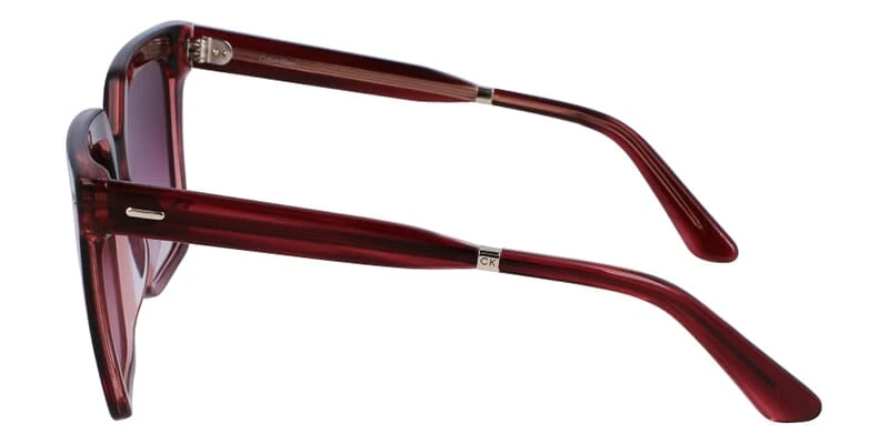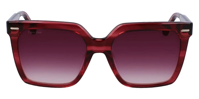 This square Calvin Klein sunglass comes in a burgundy frame with purple gradient lenses.