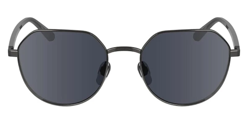 This round Calvin Klein sunglass comes in a dark gunmetal frame with grey lenses.