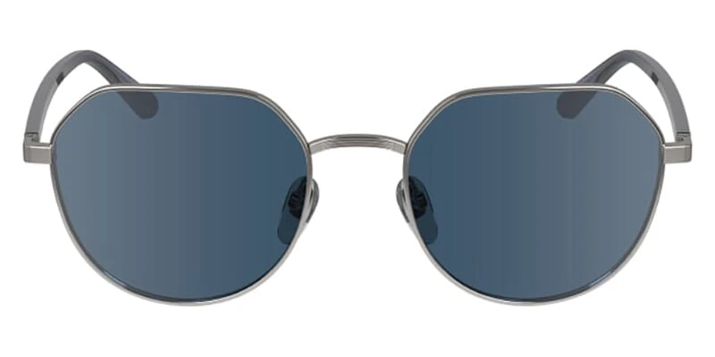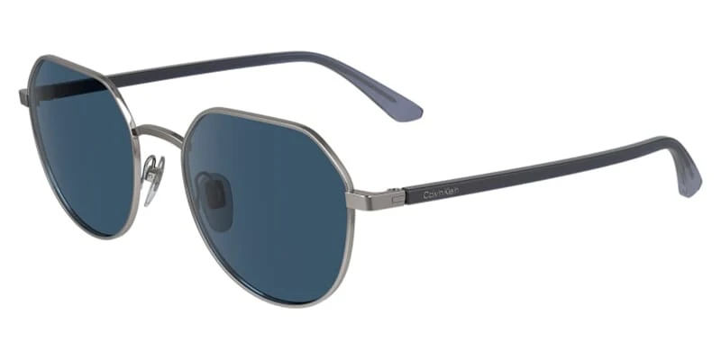 This round Calvin Klein sunglass comes in a matte light gunmetal frame with blue lenses.