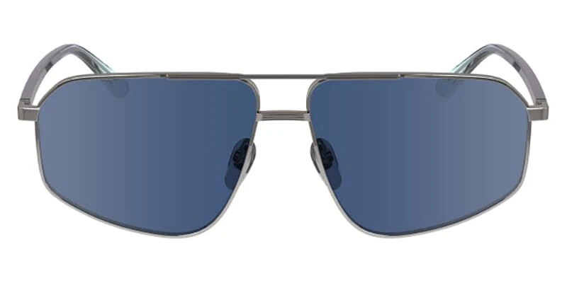 This square Calvin Klein sunglass comes in a light gunmetal frame with blue lenses.
