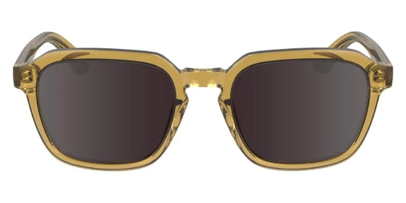 This square Calvin Klein sunglass comes in a sand frame with dark grey lenses.