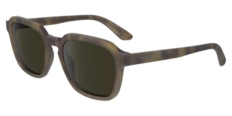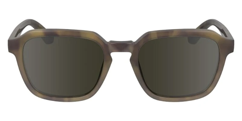 This square Calvin Klein sunglass comes in a khaki and havana frame with green lenses.
