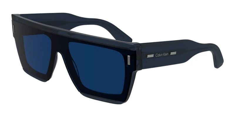 This shield Calvin Klein sunglass comes in a dark blue frame with blue lenses.