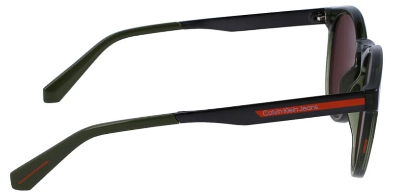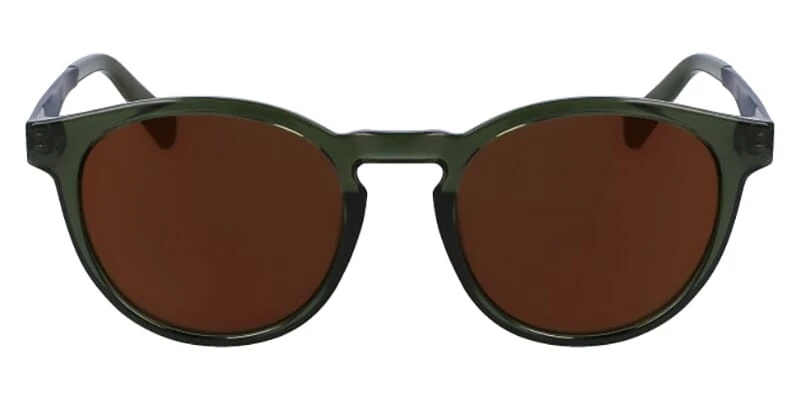 This folding round Calvin Klein sunglass comes in a transparent khaki green frame with brown with light mirror lenses.