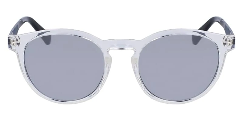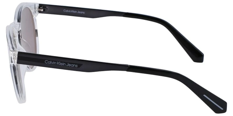 This square Calvin Klein sunglass comes in a crystal clear transparent with black frame with grey lenses.