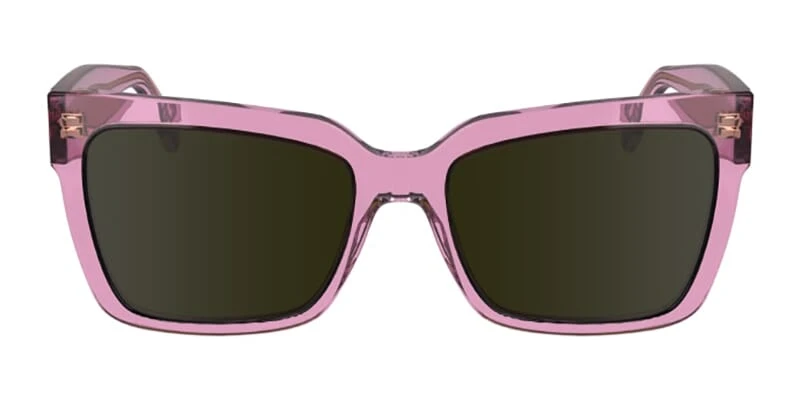 This square Calvin Klein sunglass comes in a crystal pink to khaki colour shift uv reactive frame with brown lenses.