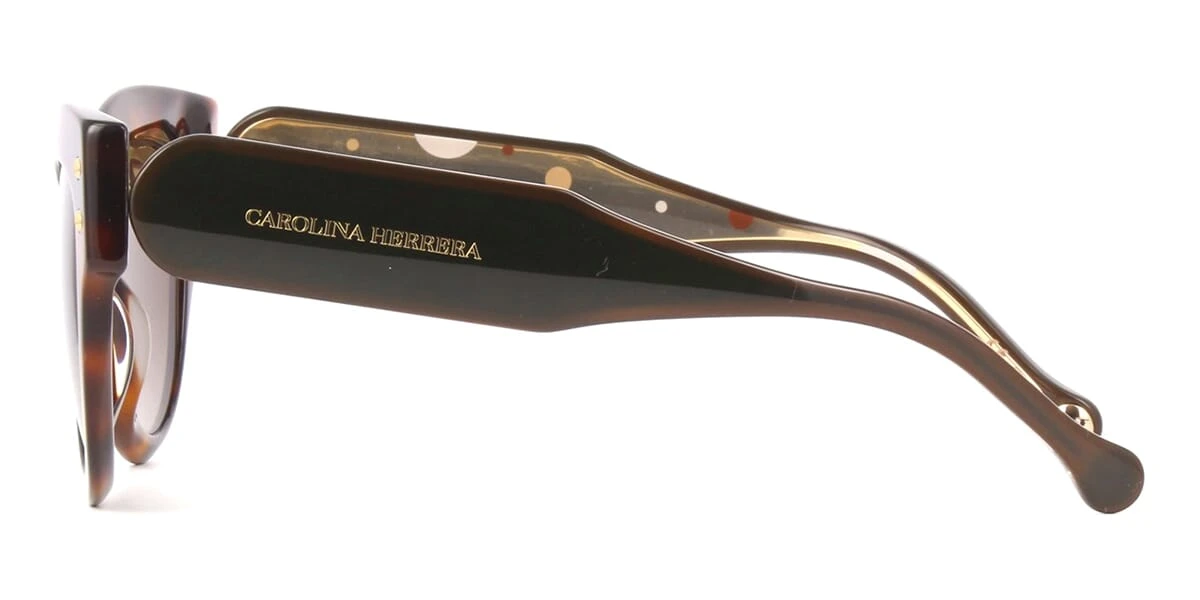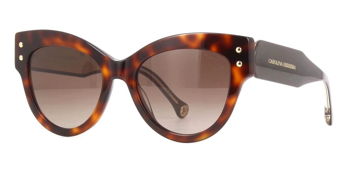 This cat eye Carolina Herrera sunglass comes in a shiny dark havana with black frame with brown gradient lenses.