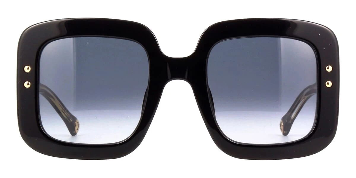 This square Carolina Herrera sunglass comes in a shiny black frame with grey gradient lenses.
