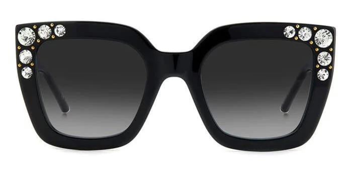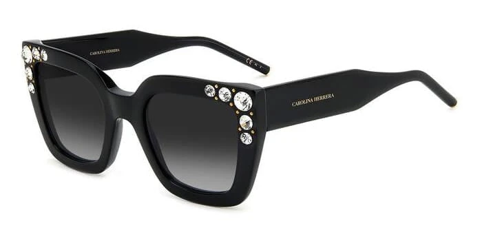 This square Carolina Herrera sunglass comes in a black with crystal frame with grey gradient cat 3 lenses.