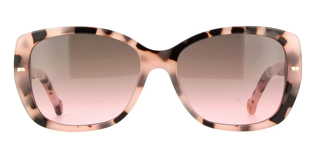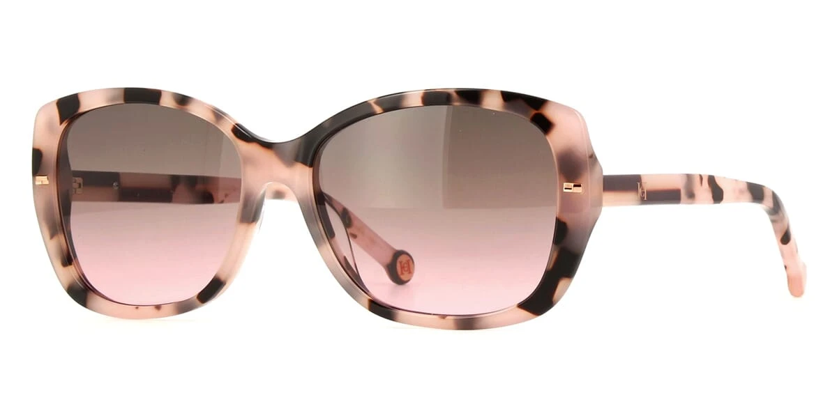 This square Carolina Herrera sunglass comes in a black spotted pink havana frame with grey to pink gradient lenses.
