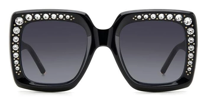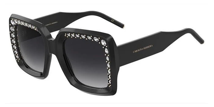 This square Carolina Herrera sunglass comes in a black with crystal and gold studs frame with grey lenses.