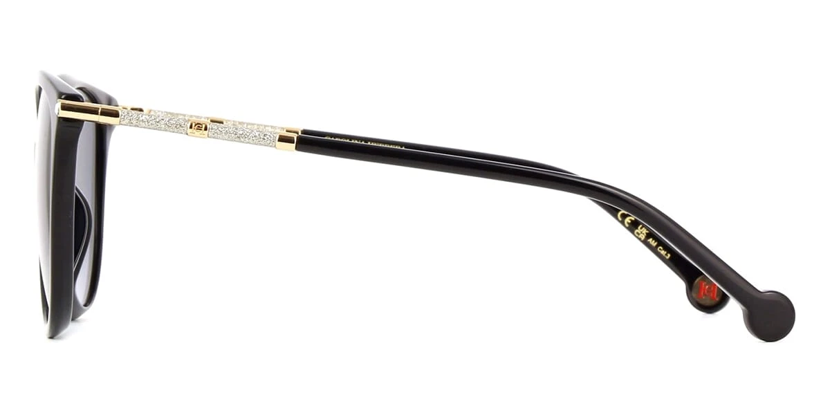 This cat eye Carolina Herrera sunglass comes in a shiny black with gold frame with grey gradient lenses.
