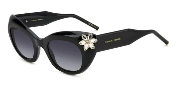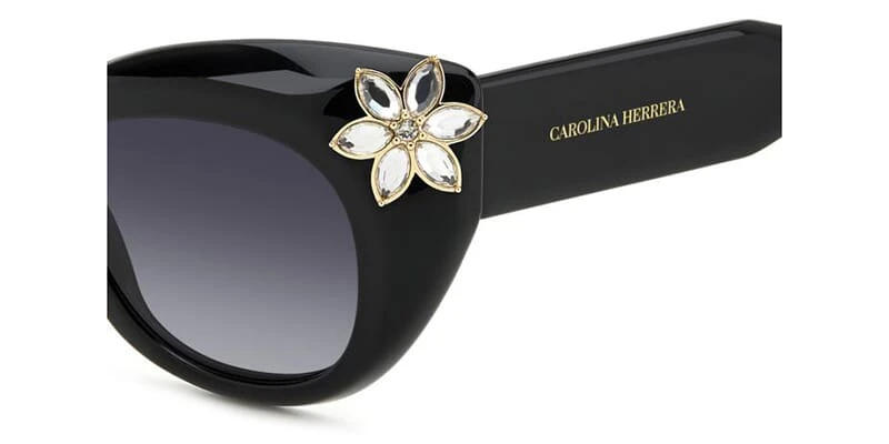 This cat eye Carolina Herrera sunglass comes in a black with crystal and gold flower detail frame with grey gradient lenses.