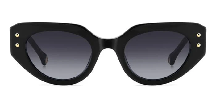 This cat eye Carolina Herrera sunglass comes in a black with pink frame with grey gradient lenses.