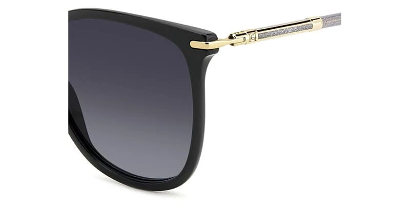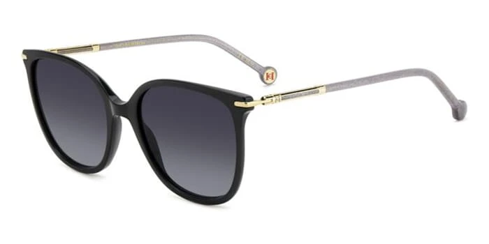This square Carolina Herrera sunglass comes in a black with silver glitter temples frame with grey gradient lenses.