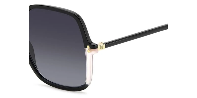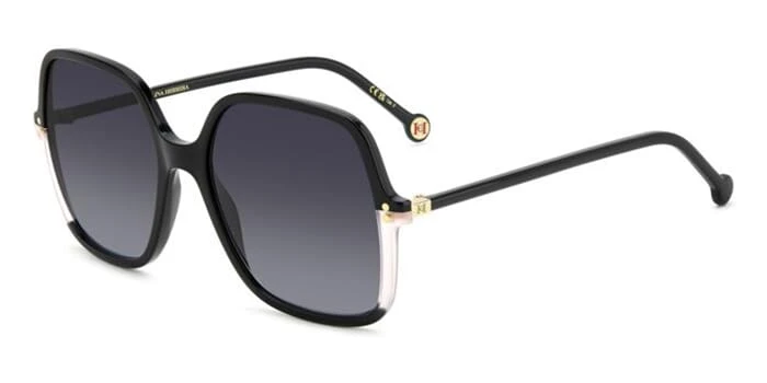 This square Carolina Herrera sunglass comes in a black with transparent pink frame with grey gradient lenses.