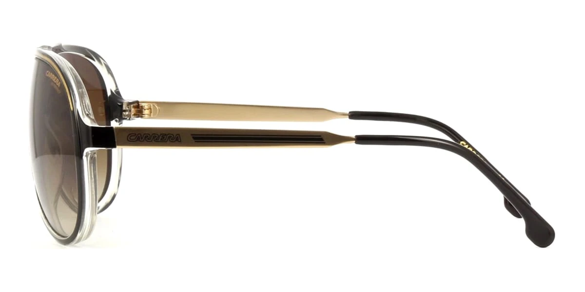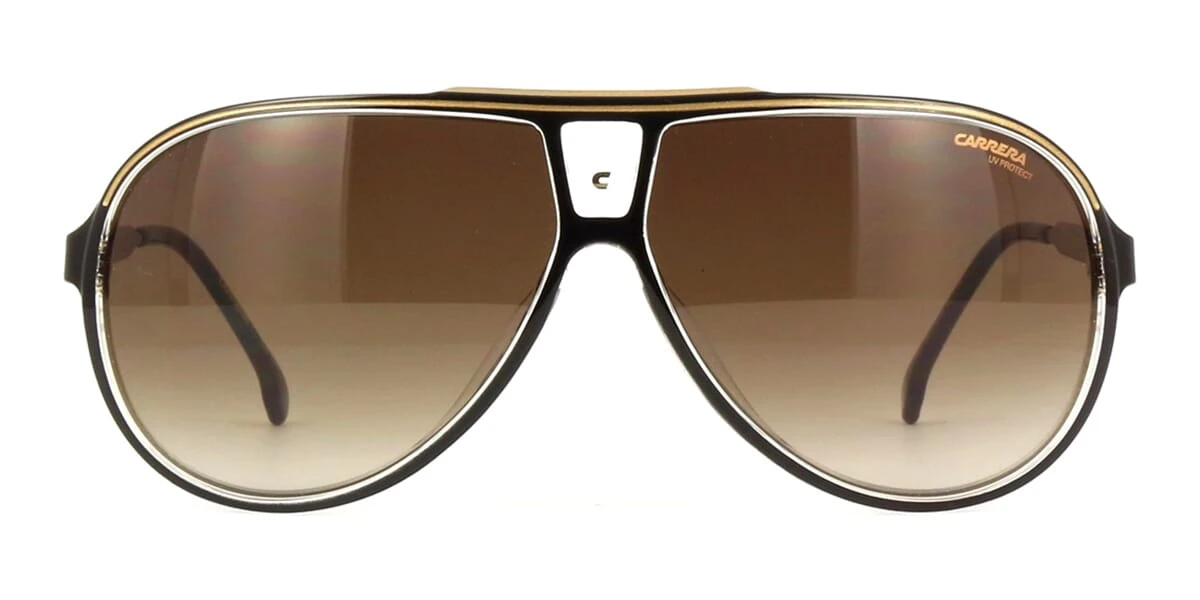 This aviator Carrera sunglass comes in a shiny black with gold frame with brown gradient lenses.