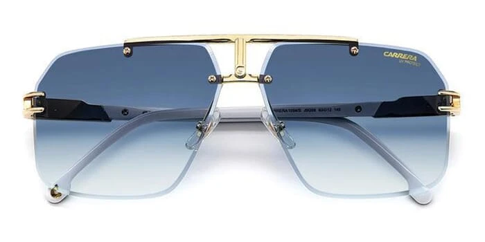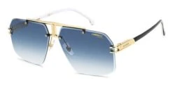 This square Carrera sunglass comes in a gold with black on white frame with blue gradient lenses.