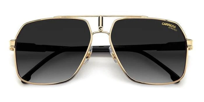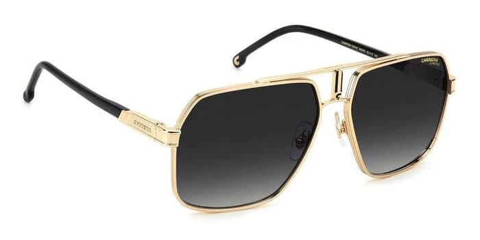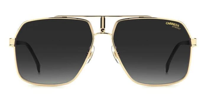 This square Carrera sunglass comes in a gold with black frame with dark grey gradient lenses.