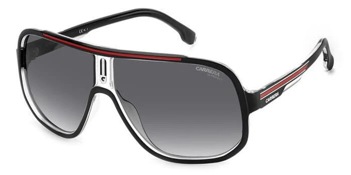 This square Carrera sunglass comes in a black with red stripe frame with grey gradient lenses.