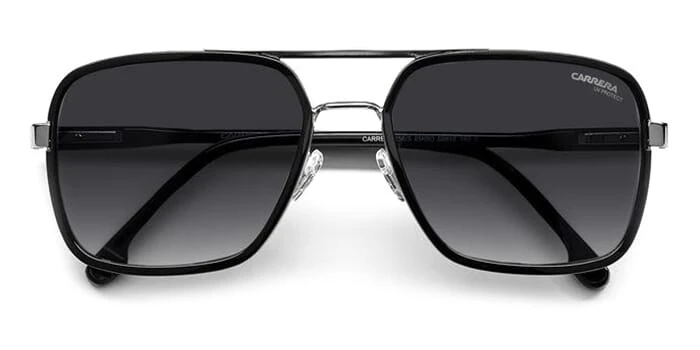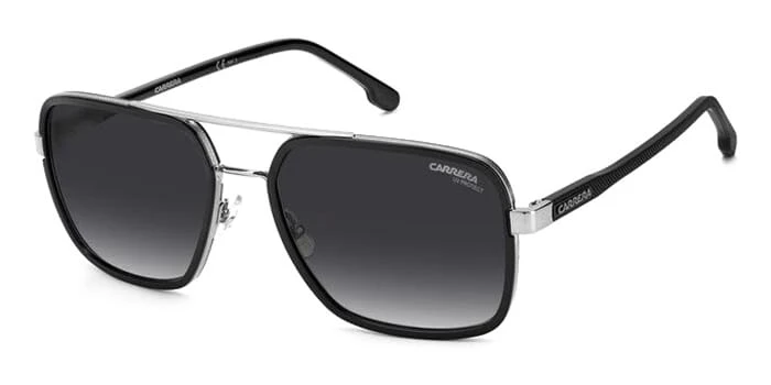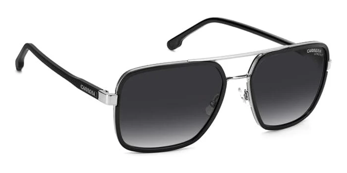 This square Carrera sunglass comes in a black and ruthenium frame with dark grey gradient lenses.