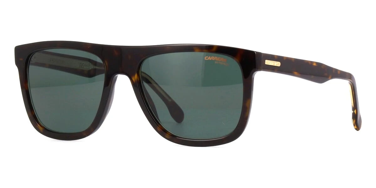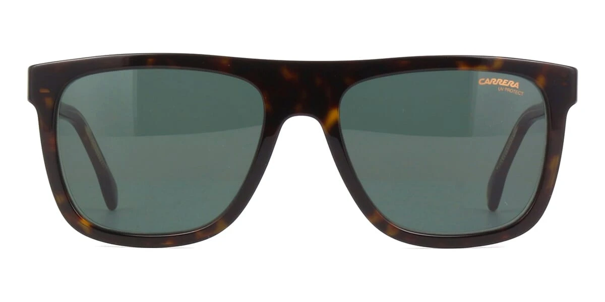 This square Carrera sunglass comes in a shiny dark havana frame with green lenses.